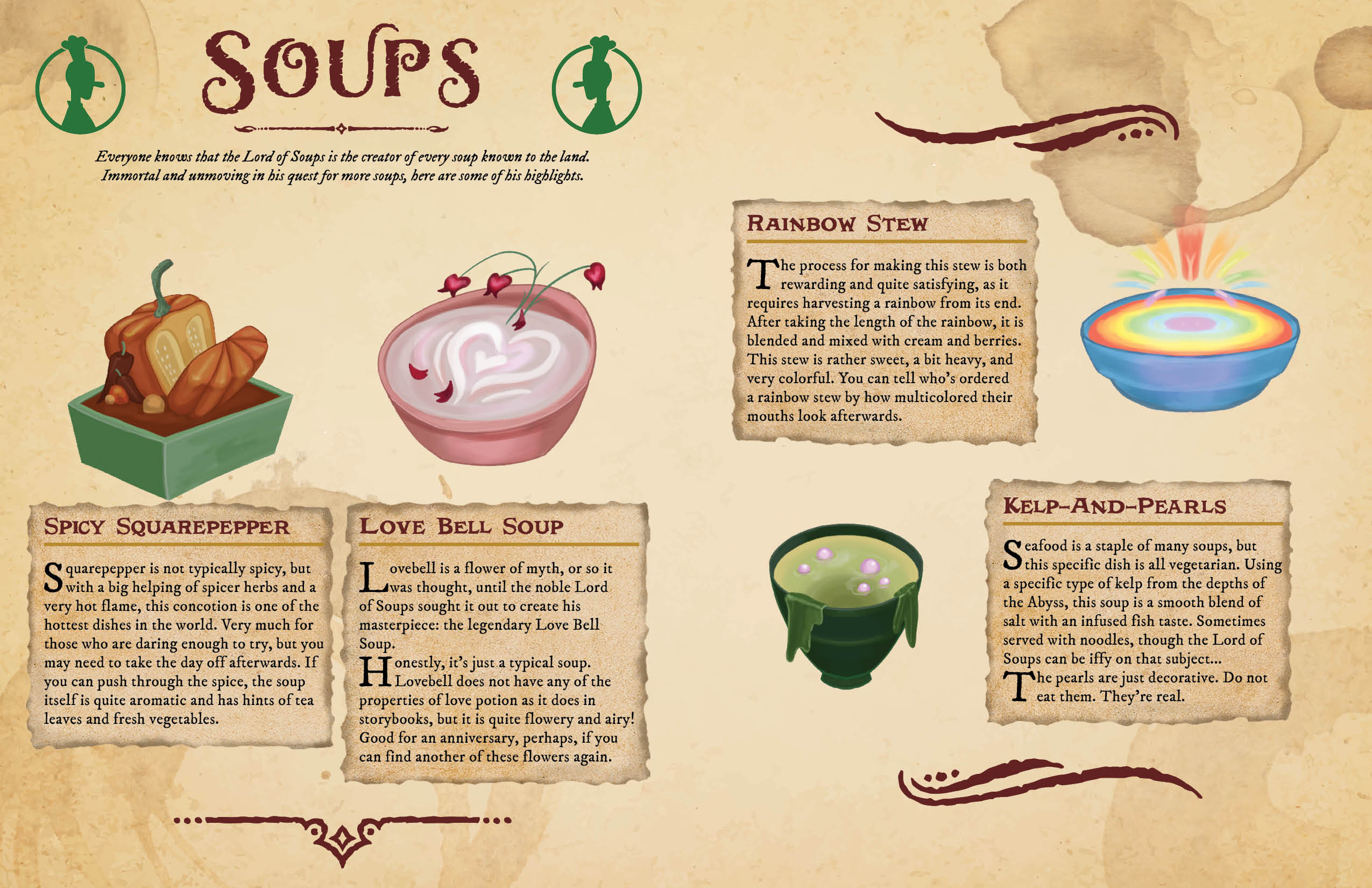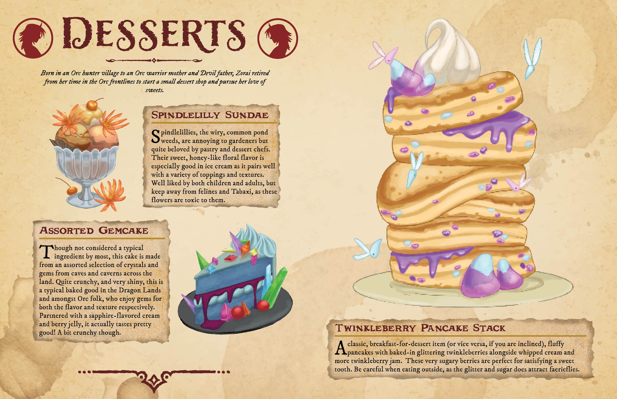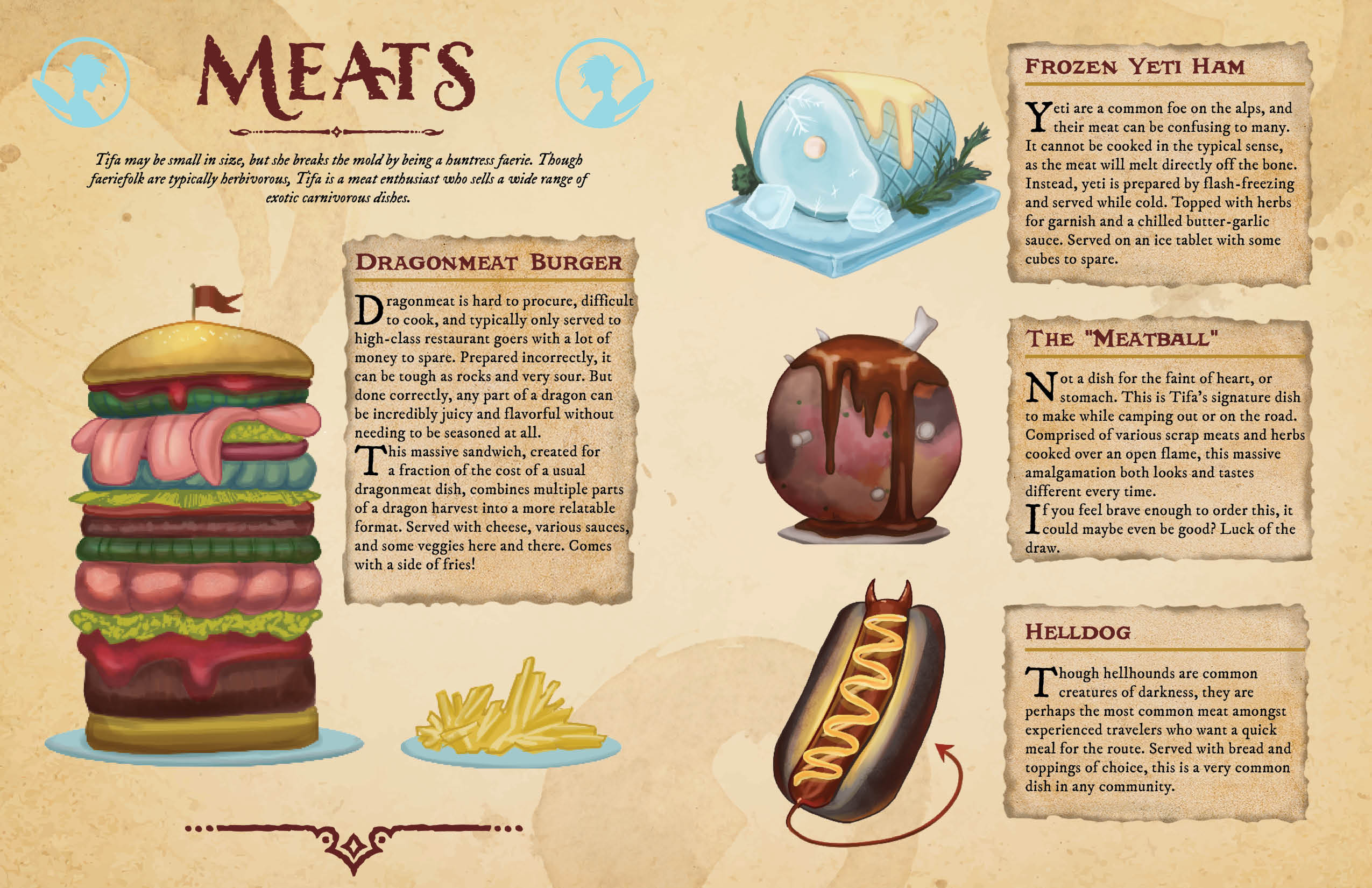 A collection of fantasy food items centered around certain characters, styling inspired by D&D manuals.